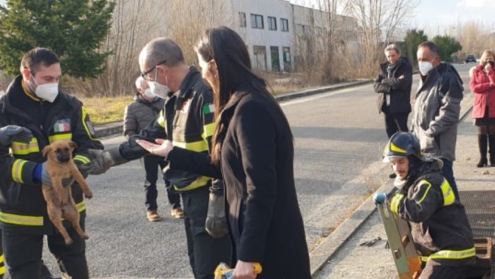 Cucciolo cade nel canale di scolo:salvato dai vigili viene adottato da 2 ragazze