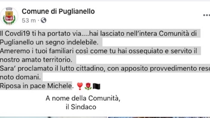 E anche a Puglianello, dove lavorava da trent'anni,il sindaco Rubano l'ha ricordato con un post: " Il Covdi19 ti ha portato via....hai lasciato nell’intera Comunità di Puglianello un segno indelebile. Ameremo i tuoi familiari così come tu hai ossequiato e servito il nostro amato territorio. Sara’ proclamato il lutto cittadino, con apposito provvedimento reso noto domani.Riposa in pace Michele".