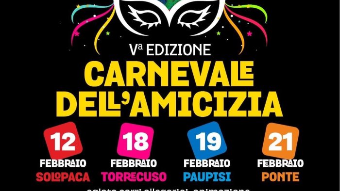 Il Carnevale dell’Amicizia sarà strutturato in quattro giornate una per ogni paese con sfilate di carri allegorici, mascherate, giochi e spettacoli vari. Si inizierà a Solopaca domenica 12 febbraio, seguirà poi Torrecuso sabato 18 febbraio e Paupisi domenica 19 febbraio con le conclusioni a Ponte martedì 21 febbraio. Il programma sarà alquanto ricco e verrà ufficializzato nei prossimi giorni.