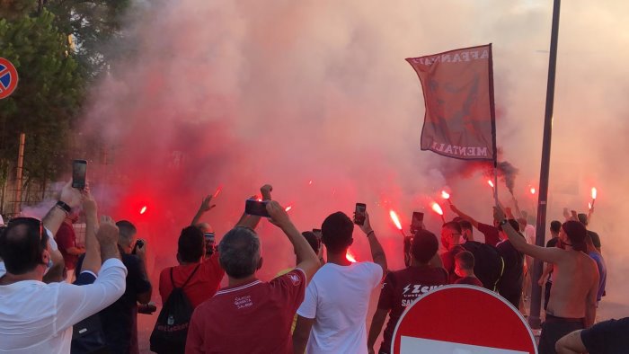 Un cordone umano a tinte granata ha scortato la Salernitana fino all'ingresso del varco 25 dello stadio Arechi. «Ci devi credere, vinciamo», la colonna sonora intonata da oltre 300 tifosi che, armati di bandiere, fumogeni (e mascherine) hanno provato a dare la carica ai calciatori granata che alle 21 affronteranno lo Spezia nella sfida decisiva per l'accesso ai play-off. Un segnale importante che testimonia l'attaccamento e la passione del popolo granata, intenzionato a vincere quest'ultima sfida di campionato per andarsi a giocare i play-off. Scene d'entusiasmo che non si vedevano da tempo e che, in parte, hanno cancellato il clima di scetticismo che ha accompagnato gran parte della stagione. Per 90' Salerno tornerà ad essere compatta per spingere il cavalluccio marino nella post-season.