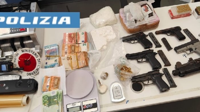 L’attività ha consentito di individuare due nascondigli, ricavati all’interno di un’autovettura in stato di semiabbandono e in un garage, dove sono stati rinvenuti 23 panetti di hashish ed altra sostanza dello stesso tipo per un peso complessivo di circa 2,5 kg, 2 confezioni di cocaina per un peso complessivo di circa un kg, un fucile mitragliatore modello Uzi cal. 9 x 19, verosimilmente di provenienza israeliana, con matricola abrasa e completo di caricatore, un revolver marca Astra calibro 357 magnum con matricola abrasa, cinque pistole semiautomatiche clandestine, di varie marche e calibro, tutte cariche e pronte all’uso, 83 cartucce di vario calibro e 20.000 euro.