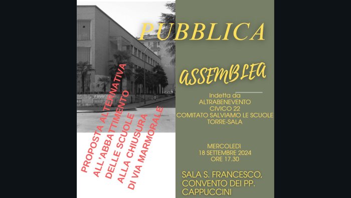 Per questi motivi il Comitato cittadino “Salviamo le scuole Torre-Sala”, i Movimenti politici Altrabenevento e Civico 22 hanno indetto una pubblica assemblea per presentare la proposta ai cittadini, agli amministratori comunali, le istituzioni scolastiche, le associazioni civiche, i sindacati e le forze politiche, mercoledì 18 settembre, alle ore 17,30 nella sala San Francesco del Convento dei PP. Cappuccini, in via Meomartini 114.