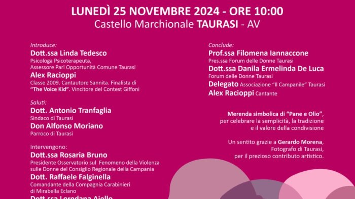 In occasione della Giornata Internazionale contro la Violenza sulle Donne, il Comune di Taurasi, la FIDAPA BPW Italy – Sezione di Grottaminarda e l’Istituto Comprensivo “Luigi Di Prisco”, con il patrocinio dell’Osservatorio sul Fenomeno della Violenza sulle Donne e dell’Ordine degli Psicologi della Regione Campania, Croce Rossa Italiana Provincia Avellino in collaborazione con numerose associazioni e realtà locali, organizza il convegno dal titolo “Donne senza fermate: l’arte di diventare se stesse”.
