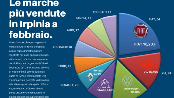 Tra i marchi più ricercati, Volkswagen sale al terzo posto davanti a Citroën che ne perde uno, mentre Renault sale in quinta posizione recuperandone ben 9 rispetto al mese scorso e davanti a Ford ora sesto. Chrysler si conferma settima davanti ad Audi, Lancia e Peugeot che guadagnano la Top-10 in crescita. Tutti i dati da domani on line sul sito AutomobilismoIrpino.it. Segue elaborazione su dati Ministero delle Infrastrutture e dei Trasporti al 2 marzo 2020.