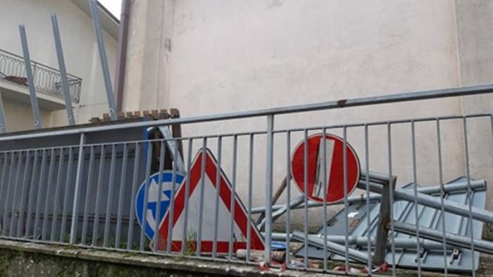 Tabelloni stradali rimossi causa vento o incidenti e lasciati a marcire davanti ad un deposito comunale. Accade ad Ariano Irpino. Tutto è documentato da foto e testimonianze.