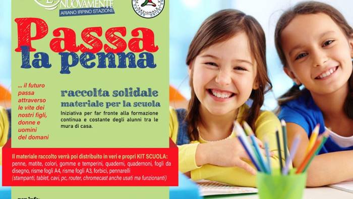 Grazie al supporto di alcuni amici docenti, ci siamo attivati cercando di capire quali fossero le esigenze dei ragazzi per far fronte alla formazione continua e costante tra le mura di casa. Abbiamo deciso quindi di avviare il progetto #passalapenna, una raccolta solidale di materiale per la scuola. Il materiale verrà poi distribuito in veri e propri “Kit scuola”." Così la Pro Loco Nuovamente di Ariano Irpino che ha avviato la raccolta e distribuzione.