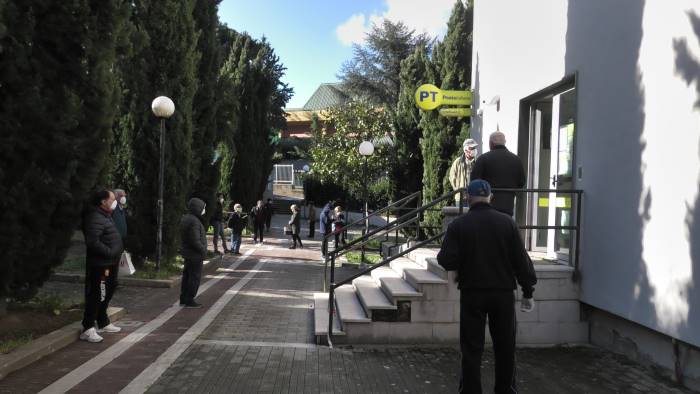 Non va meglio nel Rione Martiri. Mattinata anche qui in salita. Code fino all'imbocco della statale 90 per mantenere le distanze. Qualche anziano ammalato, ha freddo e resta in auto. Qui è aperto tutti i giorni e i due dipendenti stanno compiendo davvero un grande sforzo umano. Calvario? Qui a malapena funziona un postamat. Per la riapertura, stando all'avviso affisso all'ingresso bisgnerà attendere il giorno 20 aprile, giorno di scadenza della zona rossa in pratica. Quasi fatto apposta. Orari di apertura dal lunedì al venerdì dalle 08.20 alle 13.35 e il sabato dalle 08.20 alle 12.35. Niente più turni pomeridiani e serali.