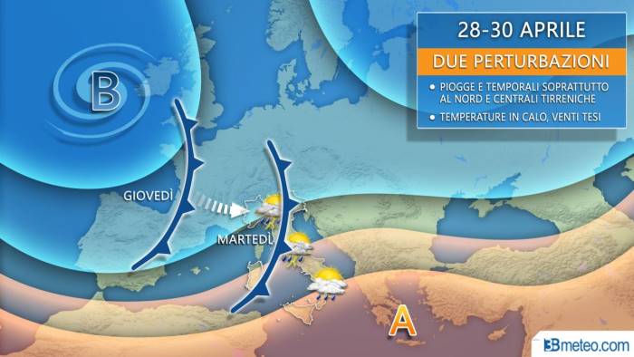 “Tra giovedì 30 aprile e venerdì 1 maggio ci attendiamo il passaggio di una veloce perturbazione, responsabile di un'altra passata di piogge e temporali soprattutto al Nord e sul versante tirrenico, accompagnata da un calo delle temperature” - avverte Ferrara di 3bmeteo.com - “tuttavia già nel weekend del 2-3 maggio prevarrà il sole, salvo ancora qualche nota instabile sui rilievi e sul basso versante tirrenico. Le temperature saranno così in netta ripresa, specie domenica e al Nord e sul versante tirrenico, dove il clima si farà più caldo.”