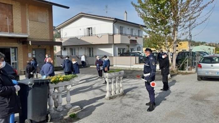 Giornata di super lavoro per il sovrintendente Luigi Pietrolà e il maresciallo Alessandro Rossi della Polizia Municipale davanti agli uffici di Calvario e Martiri al fine di invitare i cittadini a non ammassarsi.