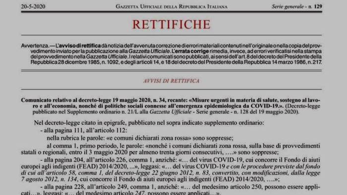 "Nel decreto-legge citato in epigrafe, pubblicato nel sopra indicato supplemento ordinario: "- alla pagina 111, all'articolo 112: nella rubrica le parole: «e comuni dichiarati zona rossa» sono soppresse; al comma 1, primo periodo, le parole: «nonche' i comuni dichiarati zona rossa, sulla base di provvedimenti statali o regionali, entro il 3 maggio 2020 per almeno trenta giorni consecutivi, ....» sono soppresse." Sulla gazzetta ufficiale di oggi, errata corrige dell'articolo 112. Lo fa notare l'avvocato Marcello Luparella.