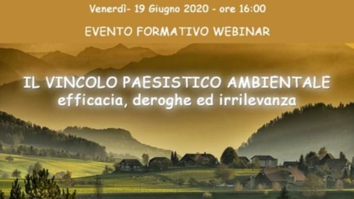 Si terrà il prossimo venerdì 19 giugno alle ore 16.00 il convegno organizzato dall’ordine degli architetti della provincia di Avellino, in modalità webinar, dal tema “Il Vincolo paesistico ambientale: efficacia, deroghe ed irrilevanza”.