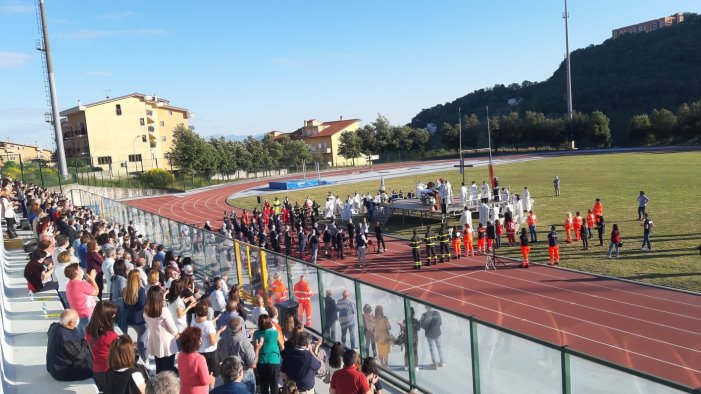 È palpabile il dolore sulle gradinate affollate dell'Arena Mennea. Ariano commemora i suoi defunti, andati via in silenzio senza la possibilità di poter ricevere un degno rito funebre nei giorni più bui e tristi dell'emergenza Covid-19. Volti affranti e occhi gonfi di lacrime accecati dal sole.