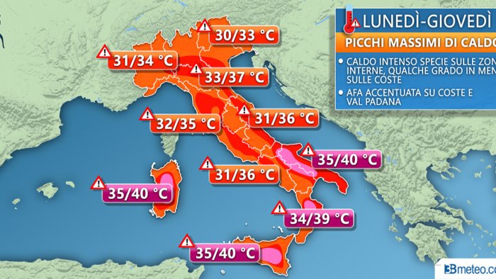 “Nella prossima settimana il caldo sarà in ulteriore intensificazione dal Nord Africa verso l’Italia, specie centro-meridionale” – avverte Ferrara di 3bmeteo.com – “tanto che entro giovedì prossimo potremmo assistere a picchi locali prossimi ai 38-40°C su Tavoliere pugliese, Lucania, cosentino e zone interne di Sicilia e Sardegna. Molto caldo anche al Centronord con picchi di 35-37°C non esclusi su aree interne di Emilia Romagna, Abruzzo, Marche, Umbria, Lazio e Toscana. Alcune tra le città più ‘roventi’: Bologna, Ferrara, Firenze, Terni, Frosinone, Roma, Macerata, Sulmona, Benevento, Foggia, Matera, Cosenza, Caltanissetta e Nuoro. Il caldo sarà anche afoso, specie sulle coste e in Pianura Padana dove a livello locale si potranno percepire temperature anche di 40°C. Il Nord sarà comunque lambito da correnti più instabili atlantiche, che potranno innescare locali rovesci o temporali in primis su Alpi e Prealpi, ma occasionalmente anche su pedemontane e alte pianure. La presenza di aria molto calda e afosa potrà favorire fenomeni brevi e localizzati ma violenti, anche associati a grandine, colpi di vento o improvvisi nubifragi. Prestare dunque attenzione”