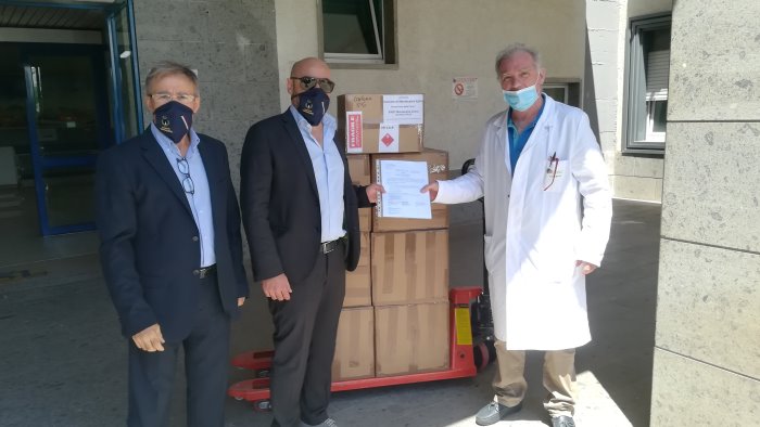 Sono state donate soluzioni idroalcoliche in diverse pezzature, gel idroalcolico, guanti monouso, mascherine Ffp2/Kn95, mascherine mediche e 1200 calzari ospedalieri blu.