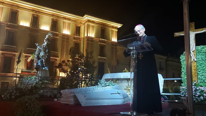 Grazie ai volontari della Misericordia e' stato disciplinato l'accesso allo spazio allestito dalla diocesi in piazza Libertà. Musica e preghiere con sullo sfondo la galleria di luminarie hanno fatto da cornice all'evento di fede e raccoglimento. Il Vescovo ha ricordato tutti, dal palco allestito per l'occasione, l'importanza del senso di comunità per rinascere, dopo la crisi, i tempi difficili della pandemia. "Insieme possiamo ripartire. Invito l'intera comunità a riflettere sull'importanza del senso della famiglia, della riunione intima e fiduciosa tra le persone, per ritrovare speranza, fiducia nel prossimo e capacità di ripresa". Presenti i responsabili delle varie parrocchie della Diocesi. La Statua della Madonna Assunta e' stata portata in piazza dai Vigili del Fuoco. Emozioni e applausi all'arrivo dell'effige in piazza. Commossi i fedeli hanno accolto la Santa Patrona della città di Avellino, tra preghiere e speranze.