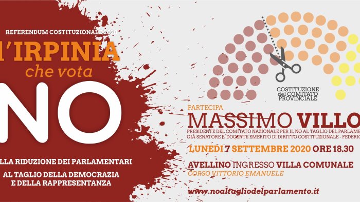 Lunedi 7 settembre alle ore 18.30 ad Avellino nei pressi della Villa Comunale, nel rispetto di tutte le misure per il contenimento del contagio dal Covid-19, si terrà la Costituzione del Comitato Provinciale per il No al referendum costituzionale del 20 e 21 settembre voluto da Avellino Prende Parte che chiama a raccolta cittadini, politica e associazioni.