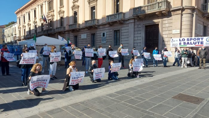 Piazza Libertà “invasa” dal mondo delle palestre. Flash mob dei titolari dei centri sportivi per protestare contro le chiusure del Governo. Una piazza colorata da tanti cartelli in maniera pacifica. In molti hanno risposto alla convocazione di Asi (Associazioni sportive sociali italiane) ed Endas (Ente sportivo italiano), enti di promozione sportiva riconosciuti dal Coni.