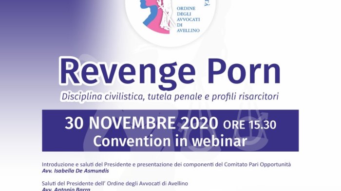 Revenge Porn, disciplina civilistica, tutela penale e profili risarcitori. Se ne parlerà oggi nel convegno organizzato dal comitato per le pari opportunità dell'ordine degli avvocati di Avellino. L'appuntamento in webibnar si terrà alle 15,30. A presentare il convegno sarà l'avvocato Isabella De Asmundis. A seguire gli interventi del presidente dell'ordine degli avvocati, Antonio Barra, del professore Angelo Maietta, il professore Paolo Spagnuolo, il professore Flavio Argirò, il dottore Nazario Maisto, la dottoressa Raffaella Parrotta. Saranno gli avvocati Carolina Schettino e Linda Orabona a moderare gli interventi. L'evento garantirà tre crediti formativi ai partecipanti.