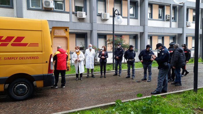 Prima fornitura di vaccini anti Covid-19 all'ospedale Sant'Ottone Frangipane di Ariano Irpino. Questa mattina la consegna di 195 flaconi scortati dalle forze dell'ordine, polizia e carabinieri. Il polo ospedaliero arianese, struttura simbolo nella fase più critica della pandemia, individuato come hub per la distribuzione. Presente al momento della consegna il direttore generale dell'Asl di Avellino Maria Morgante, il direttore sanitario Angelo Frieri.