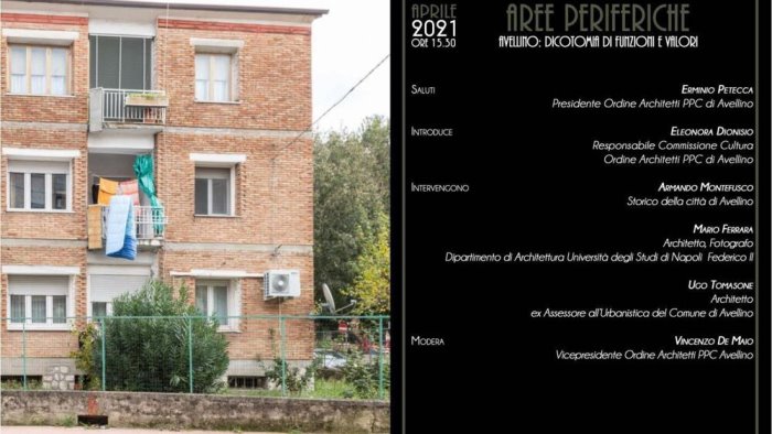 Si terrà domani 7 aprile alle ore 15:30, in modalità webinar, l’incontro organizzato dall’ordine degli Architetti della provincia di Avellino sul tema: “Aree periferiche. Avellino: dicotomia di funzioni e valori”. Aprirà l’evento Erminio Petecca, presidente dell’ordine degli architetti irpini. Introdurrà Eleonora Dionisio, responsabile della commissione cultura. Interverranno Armando Montefusco, storico della città di Avellino, Mario Ferrara, docente di architettura dell’università di Napoli, esperto di fotografia, Ugo Tomasone, architetto, già assessore all’urbanistica di Avellino. Modererà Vincenzo De Maio, vicepresidente dell’ordine.