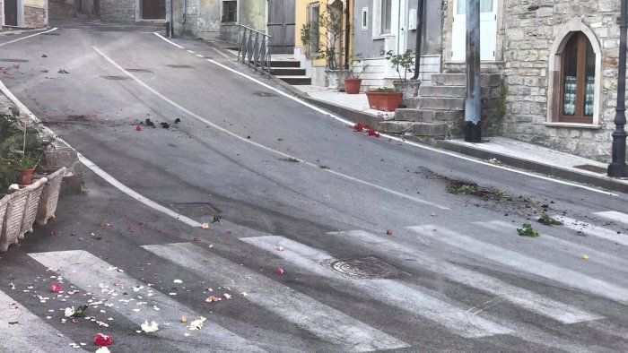 Manifesti da lutto scherniti, piante devastate, fiori strappati e buttati in strada, disordine all'ingresso del paese.
