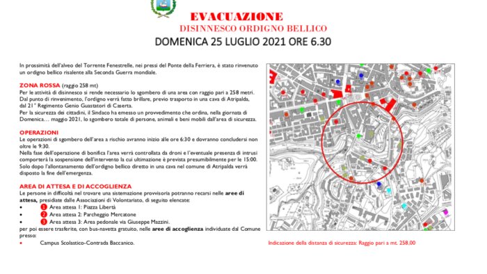 Per le attività di disinnesco si rende necessario lo sgombero di una area con raggio pari a 258 metri. Dal punto di rinvenimento, l’ordigno verrà fatto brillare, previo trasporto in una cava di Atripalda, dal 21° Regimento Genio Guastatori di Caserta.