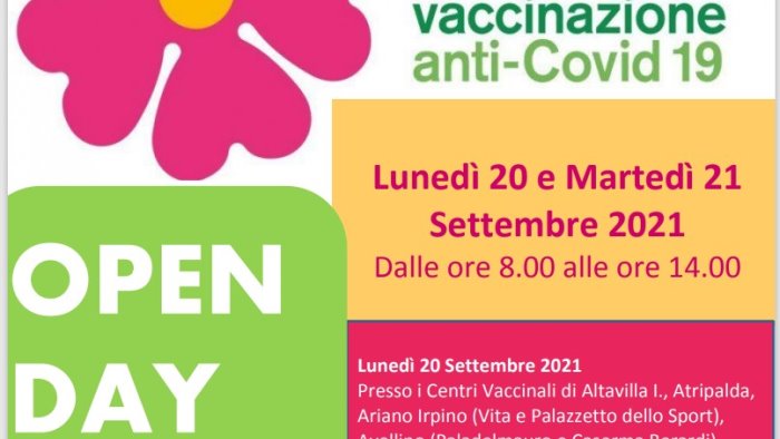 Il 21 settembre 2021 saranno attivi i Centri Vaccinali di Altavilla I., Ariano I. ( Vita e Palazzetto dello Sport), Atripalda, Avellino (Paladelmauro e Caserma Berardi), Bisaccia, Cervinara, Grottaminarda, Lioni, Mercogliano, Mirabella E., Montefalcione, Montella, Montemarano, Monteforte I., Montoro, Moschiano, Mugnano del C., Sant’Angelo dei Lombardi, Solofra, Vallata