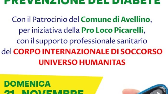 Domenica 21 novembre dalle ore 9.00 alle 13,00 nella piazza del Ss.mo Salvatore del borgo di Picarelli, per iniziativa della Pro Loco Picarelli, con il patrocinio del comune di Avellino e con il supporto del Corpo Internazionale di Soccorso Universo Umanitas si terrà uno screening gratuito per la prevenzione del diabete. In un camper appositamente attrezzato con personale sanitario specializzato ogni cittadino potrà effettuare un accurato controllo diabetologico al fine di prevenire una delle patologie che oggi maggiormente affliggono la nostra società moderna. I soggetti maggiormente esposti sono le persone anziane ma non sono rari anche i giovani ed i bambini colpiti dalla patologia. L’iniziativa si propone di promuovere attraverso questo screening preventivo uno stile di vita che possa evitare l’insorgenza della patologia.Lo screening si svolge anche con la collaborazione ed il contributo del Lions Club, delle Antiche Fattorie Templari, del Serenissimo Ordine della Natività e del Sovrano Ordine dei Cavalieri Templari.