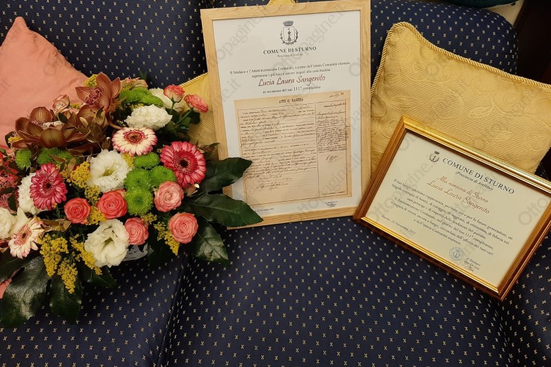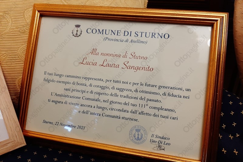 "Il tuo lungo cammino rappresenta, per tutti noi e per le future generazioni, un fulgido esempio di bontà, di coraggio, di saggezza, di ottimismo, di fiducia nei sani principi e di rispetto delle tradizioni del passato. L'amministrazione comunale nel giorno del tuo 111°compleanno, ti augura di vivere ancora a lungo, circondata dall'affetto dei tuoi cari e dell'intera comunità sturnese." Insieme al primo cittadino Di Leo gli assessori Gerardo Solomita e Carola Cipriano e i consiglieri comunali Nunzio Morra, Lilli Stanco e Giuseppe Nitti. "E' l'esempio di una famiglia umile, di sani principi e valori basati sul rispetto innanzitutto. E' una giornata di grande gioia per tutta la comunità di Sturno."