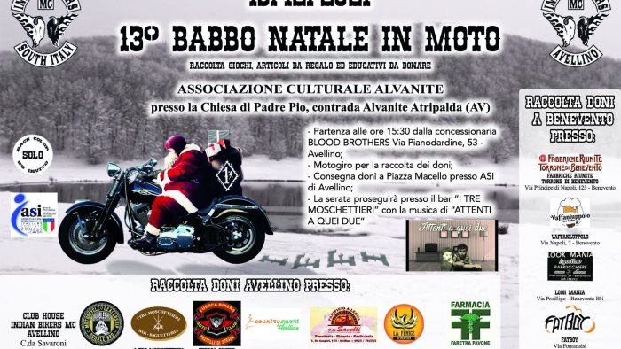 Doni in moto ad Avellino e Atripalda, per un Natale all’insegna del senso autentico delle feste e della gioia dei bambini. Tornano ad emozionare i Babbo Natale in moto, per una domenica speciale ed emozionante. Domani, domenica 19 dicembre 2021, si terrà la 13esima edizione del “Babbo Natale in moto”, organizzata dagli Indian Bikers MC Avellino. Un appuntamento, che anno dopo anno, conferma il desiderio degli organizzatori e partecipanti di dedicare ai bambini un momento speciale di festa, doni e sorrisi. I motociclisti ( circa 30 con la partecipazione dei Fuerca Bikers di Avellino e i Legio Linteata di Benevento ) sfileranno vestiti da Babbo Natale tra Avellino ed Atripalda, per consegnare doni ai bambini, tra sorrisi e rombo dei motori. I regali sono stati consegnati tra numerosi punti raccolta che in queste settimane hanno collaborato all’iniziativa tra Irpinia e Sannio, ad Avellino presso la Farmacia “Faretra”, il “Panificio Savelli”, il “Country sport”, la concessionaria “Bloodbrothers”, il bar baguetteria “I tre Moschettieri” , il ristorante “La fenice”, nel Sannio presso “Fabbriche Riunite Torrone di Benevento”, “Vaffanluppolo”, “Look Mania”, il bar "Piccadilly" , il pub “Fat Boy” e i gruppi motociclistici sopra menzionati, sarà consegnata ai bimbi a piazza Kennedy, nel Villaggio di Babbo Natale, nel parco giochi, l’altra ai piccoli ospiti di una casa famiglia ad Atripalda. La raccolta doni è in programma alle ore 15.30, presso la concessionaria Bloodbrothers di via Pianodardine, 53. Intorno alle ore 16 è prevista la partenza. Ecco il percorso: via Tedesco, via Circumvallazione ( stop presso ristorante la Fenice per nuova raccolta doni), zona Tribunale, via de Conciliis , viale Platani, via Roma, Corso Europa, piazza Libertà, via Nappi, centro storico, piazza Kennedy, fino all’arrivo nel Villaggio di Babbo Natale, per la consegna ai bimbi, prevista per le ore 17.30. Dopo piazza Kennedy i bikers torneranno in sella e raggiungeranno, in forma privata, la casa famiglia ad Atripalda . Ma ci sarà anche uno stop al bar Clicqout in piazza Umberto ad Atripalda. La conclusione del Babbo Natale in moto si terrà presso il bar baguetteria “I Tre Moschettieri “in piazza Castello ad Avellino, alle 19.30, per un brindisi, con la musica di “Attenti a quei due”.