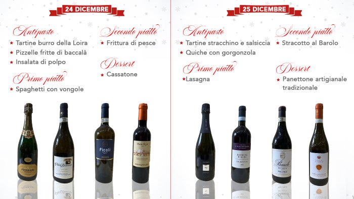 Per quanto riguarda il cenone del 24 dicembre si potrebbe partire con un antipasto a base di tartine burro della Loira e salmone o acciughe del Cantabrico, pizzelle fritte di baccalà e insalata di polpo. A tutto ciò abbineremo una bottiglia di bollicine “Trento Doc Ferrari Perlè 2015”, ma potrebbe essere tranquillamente un Franciacorta o perché no, anche uno champagne.