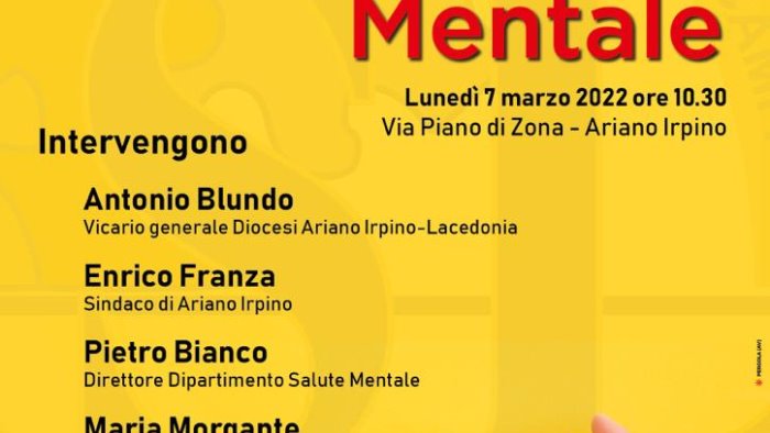 Sarà inaugurato lunedì 7 marzo alle ore 10.30 in Via Piano di Zona il nuovo Centro di Salute Mentale di Ariano Irpino. All'evento interverranno: Antonio Blundo, Vicario generale Diocesi Ariano Irpino-Lacedonia, Enrico Franza, Sindaco di Ariano Irpino, Pietro Bianco, Direttore Dipartimento Salute Mentale, Maria Morgante, Direttore generale ASL Avellino.