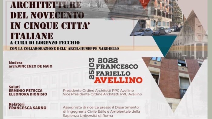 Giunge alla conclusione venerdì 25 marzo alle ore 16.30, attraverso la piattaforma webinar, il ciclo di incontri dal titolo “L’architettura del Novecento in cinque città italiane” curato da Lorenzo Fecchio con la collaborazione dell’arch. Giuseppe Nardiello. In questo incontro saranno trattate le architetture di Francesco Fariello realizzate nella città di Avellino, analizzate dal punto di vista storico e compositivo, attraverso documenti e disegni di archivio. Interverranno Erminio Petecca, presidente dell’ordine irpino, Eleonora Dionisio, vice presidente dell’ordine, relazionerà Francesca Sarno, dottore di ricerca in Composizione architettonica e urbana e assegnista di ricerca presso il dipartimento di ingegneria civile edile e ambientale della Sapienza di Roma, Marianna Gaetani dottore di ricerca in storia dell’architettura presso il Politecnico di Torino, Giovanni Rossano, architetto. Modererà l’arch. Vincenzo De Maio. Quest’ultimo incontro, sarà dedicato all’operosità creativa e professionale di Fariello e alle opere presenti sul territorio cittadino. Opere pubbliche e costruzioni private, quali il Museo Irpino, la Camera di Commercio e l’I.T.I.S. Costruzioni che rappresentano eloquenti esempi di architettura del ‘900 in Italia, realizzati negli anni che precedono e seguono la seconda guerra mondiale, in una vita, quella di Francesco Fariello, che si è svolta tra Sant’Angelo dei Lombardi, Avellino e Roma, dove insegnò alla Facoltà di Architettura.