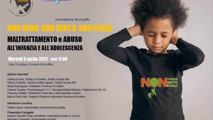 Dopo le tappe nelle altre province campane coinvolte nel progetto, si terrà martedì 5 aprile 2022, alle 11:00, presso la Sala Consiliare del Comune di Avellino, la conferenza stampa di presentazione di “Non vedo, non sento, non parlo”, un progetto selezionato da Con i Bambini nell’ambito del Fondo per il contrasto della povertà educativa minorile, promosso dalla cooperativa sociale La Goccia di Avellino in qualità di soggetto capofila, nel bando Ricucire i Sogni - Iniziativa a favore dei minori vittime di maltrattamento.
