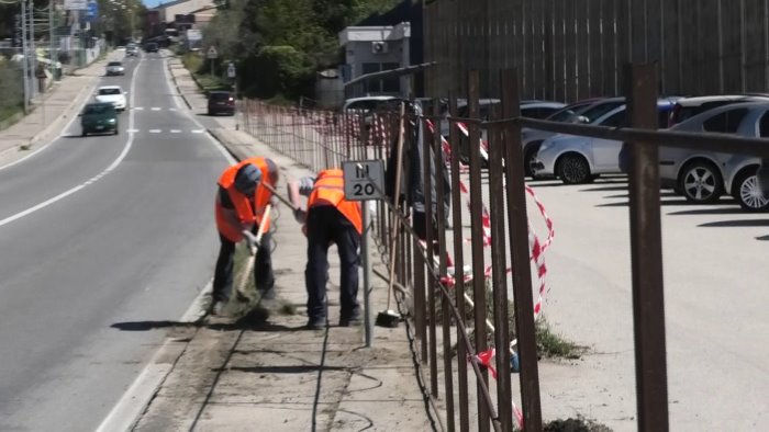 E’ l’immagine del carcere che si apre all’esterno, con i detenuti impegnati in attività di miglioramento del decoro urbano, fuori dalla struttura in cui sono ospitati. Marciapiedi, nel caso di via Cardito, lungo la statale 90 delle puglie letteralmente abbandonati da anni, come la stessa rete di recinzione che separa la strada dal carcere Campanello.