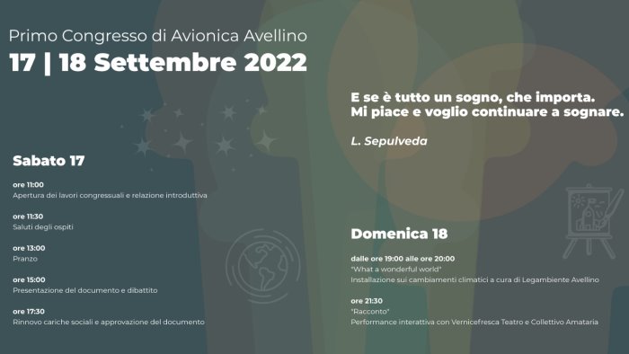 La giornata del 17 sarà incentrata sui lavori congressuali, con i contributi delle realtà che in questi anni hanno collaborato con l’associazione e l’approvazione dei documenti congressuali, con inizio alle ore 11 e termine alle ore 18. Nella giornata di domenica, invece, ci saranno due momenti esperienziali. Il primo, costruito in collaborazione con Legambiente dal nome "What a wonderful world", avrà inizio alle ore 19 e sarà incentrato sulla più grande emergenza del nostro tempo: i cambiamenti climatici. Il secondo invece, costruito con in collaborazione con Libero Spazio d’Arte e Regno di Amataria, avrà inizio alle ore 21:30 e proverà a raccontare cosa è stata Avionica in questi anni attraverso diverse forme d’arte.