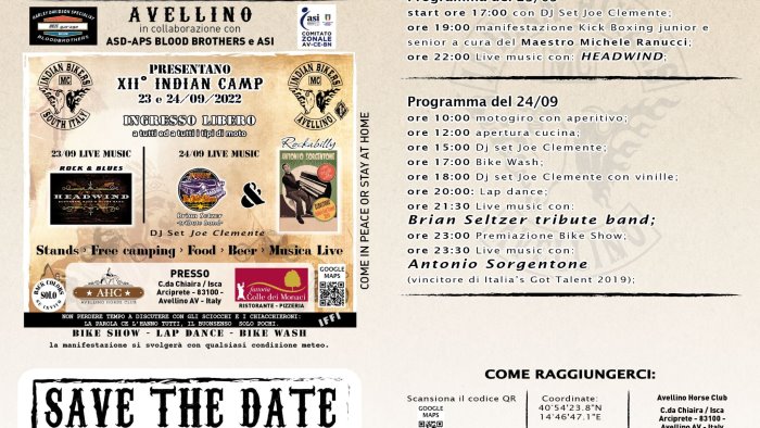 Due giorni di eventi per il 12esimo Indian Camp degli Indian Bikers Mc South Italy Avellino. Il prossimo 23 e 24 settembre nella Avellino Horse Club moto, rock, gusto e divertimento due giorni da non perdere. Concerti, stand gastronomici, campeggio libero, Lap Dance. Bike wash e Bike Show con una special Guest d’eccezione Antonio Sorgentone, che animerà il palco del maneggio di contrada Chiaira per il concerto di punta di sabato sera. Un grande evento, che vedrà arrivare ad Avellino motociclisti e appassionati, famiglie e gruppi da tutta la Campania e non solo. L’evento celebra un nuovo importante traguardo per la club house di Avellino, che aprirà le porte per un Indian Camp che si annuncia dai grandi numeri e sarà punto di riferimento per un lungo fine settimana di divertimento. Ingresso libero, dunque, e un invito al divertimento sano e genuino. L’Avellino Horse Club apre le porte per l’evento realizzato in collaborazione con Asp-Asp Blood Brothers e Asi. Ecco il programma, con tanti eventi da non perdere: