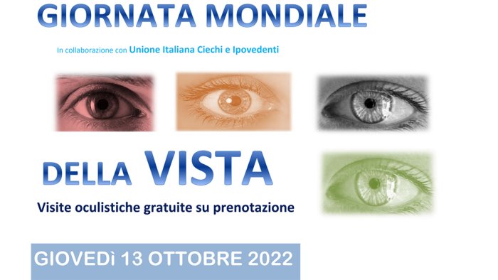 Il prossimo 13 ottobre 2022 si celebrerà la Giornata Mondiale della Vista. Per l'occasione l'Asl di Avellino, in collaborazione con l'Unione Italiana Ciechi e Ipovedenti, ha promosso una giornata di visite oculistiche gratuite, su prenotazione, presso gli ambulatori del Centro Australia di Avellino e del P.O. “Frangipane” di Ariano Irpino.