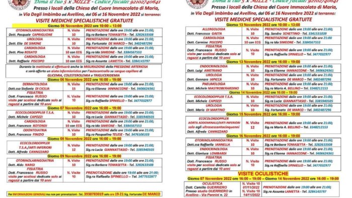 Domenica 06 novembre 2022 presso la Chiesa Del Cuore Immacolato di Maria in Via Degli Imbimbo ad Avellino- partenza alle ore 10:00 con le visite cardiologiche dei dottori Pino Rosato e Raffaele Piscopo, le visite urologiche a cura del dottore Elia De Simone e le otorinolaringoiatriche a cura del dottore Pasquale Capriglione.