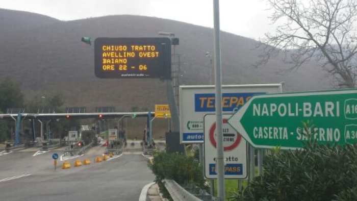 Sulla A16 Napoli-Canosa, per consentire lo spostamento di new jersey sul viadotto "Del Varco", dalle 22:00 di martedì 3 alle 6:00 di mercoledì 4 gennaio, sarà chiuso il tratto compreso tra Avellino est e Benevento, verso Canosa/A14 Bologna-Taranto.