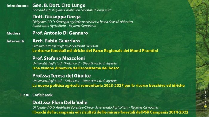 Martedì 21 Marzo 2023 alle ore 09.30, presso l’Auditorium della Bper Banca al Centro Direzionale di Collina Liguorini in Avellino si terrà l’evento “Giornata internazionale delle Foreste – Tutela e valorizzazione del patrimonio idrico e forestale della Campania”, organizzato dall’Assessorato all’Agricoltura della Regione Campania e dal Comando Regione Carabinieri Forestale “Campania”. L’evento intende celebrare la Giornata Internazionale delle Foreste, istituita il 21 dicembre 2012 con risoluzione dell’Assemblea generale delle Nazioni Unite (ONU), e sensibilizzare le giovani generazioni sulle tematiche della tutela e valorizzazione delle risorse forestali, che formano anche un inscindibile e prezioso connubio con le risorse idriche, sulle quali è necessario porre massima oculatezza per la gestione sostenibile delle stesse. Oltre alla partecipazione di importanti cariche istituzionali, saranno presenti, quindi, anche gli studenti delle ultime classi delle scuole superiori, che potranno trarre spunti preziosi anche in materia di orientamento circa il loro prosieguo universitario. Infine, la partecipazione ai lavori della giornata darà anche diritto al riconoscimento della formazione continua e all’attribuzione dei crediti formativi da parte della Federazione dei Dottori agronomi e forestali e dei Collegi dei Periti agrari e degli Agrotecnici e Agrotecnici laureati.