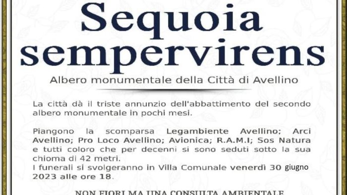 "Siamo sempre più convinti che solo tramite un sano e leale confronto si sarebbe potuto provare a salvare la pianta - continuano gli ambientalisti - e si potrà programmare davvero una Avellino sostenibile, smart e green. I proclami non ci servono, i cittadini e le cittadine vogliono i fatti e noi rientriamo tra questi. Per questo abbiamo scelto di celebrare il funerale della Sequoia Monumentale venerdì 30 giugno 2023 alle 18 presso la villa comunale di Avellino. La manifestazione è aperta a tutta la cittadinanza e vedrà la partecipazione, oltre che di Legambiente Avellino, anche di altre realtà associative del territorio come Arci Avellino, Pro Loco Avellino, Avionica, R.A.M.I, Sos Natura".