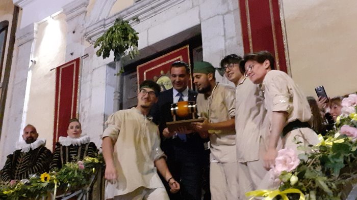 Gioia e tensioni, come in ogni gara che si rispetti. Alla fine la 27esima edizione del Palio della Botte di Avellino è stata vinta dalla squadra di Parco del Principe, la contrada che rappresenta il rione Parco. Una sfida appassionante sguita fino a tarda sera da migliaia di persone, ennesimo successo per una rievocazione storica che continua a suscitare grande interesse anche al di fuori dei confini provinciali. A premiare la squadra vincitrice il sindaco Gianluca Festa.