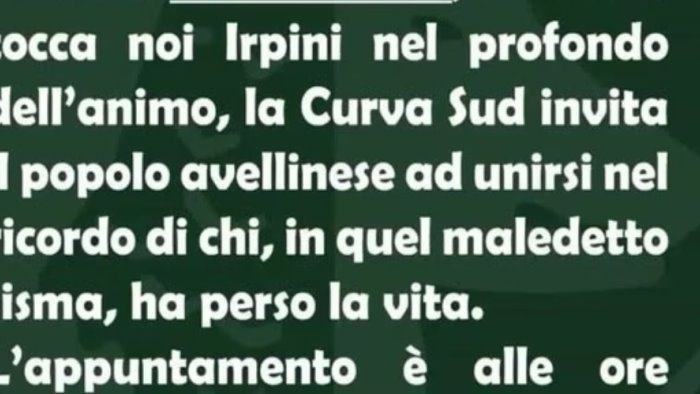 "Oggi 23 novembre, data che tocca noi Irpini nel profondo dell'animo, la Curva Sud inuita il popolo avellinese ad unirsi nel ricordo di chi, in quel maledetto sisma, ha perso la vita.