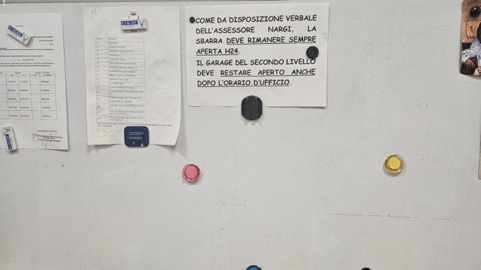 “Come da disposizione verbale dell’assessore Nargi, la sbarra deve rimanere sempre aperta h24. Il garage di secondo livello deve restare aperto anche dopo l’orario d’ufficio”.