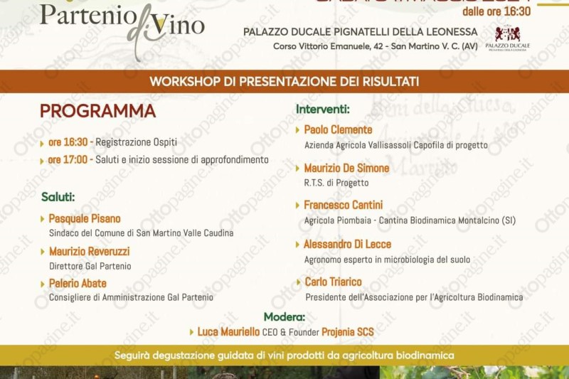 Di questo e tanto altro, con esempi pratici e primi risultati, si è parlato questo pomeriggio a San Martino Valle Caudina, dove si è svolto il workshop del progetto “Partenio diVino” (Misura 16.1.1. Az. 2 del PSR Campania 2014/2020 del Gal Partenio ) coordinato dalla società di consulenza Projenia SCS, di Luca Mauriello che vede come azienda agricola capofila la “Vallisassoli” di Paolo Clemente.