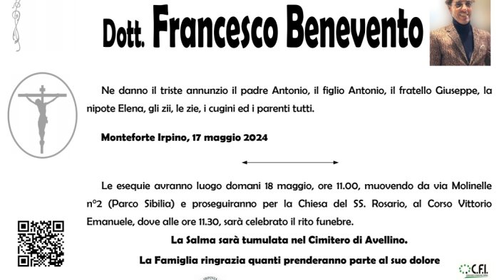 La comunità di Avellino è in lutto per la prematura scomparsa di Francesco Benevento, imprenditore 50enne particolarmente amato in città. Sempre solare, simpatico e disponibile con tutti è stato per anni punto di riferimento del gruppo Finauto, concessionario esclusivista Audi ad Avellino e Benevento. Francesco si è spento tra l'affetto dei suoi cari. Il suo cuore si è fermato dopo una dolorosa battaglia contro un male incurabile. Il 50 enne, che viveva da tempo a Sharm el - sheik in Egitto, era rientrato in Italia per stare accanto al padre, Antonio, capostipite dell'azienda di famiglia. Apprezzato da tutti i clienti per il suo sorriso e la sua proverbiale accoglienza, lascia attonita l'intera Irpinia ed il mondo dell'imprenditoria irpino. Francesco lascia suo padre Antonio, il figlio Antonio, il fratello Giuseppe, la nipote Elena, gli zii, cugini e parenti tutti. I funerali si terranno domani, sabato 18 maggio 2024, alle ore 11. 00 nella chiesa del Rosario ad Avellino.