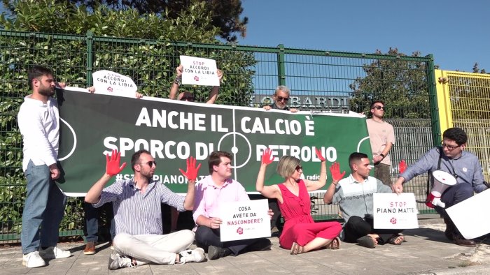 Sit in dei Radicali Italiani nel pomeriggio di fronte allo stadio Partenio Lombardi di Avellino dove si stanno svolgendo, a porte chiuse, i playoff della Libian Premier League.