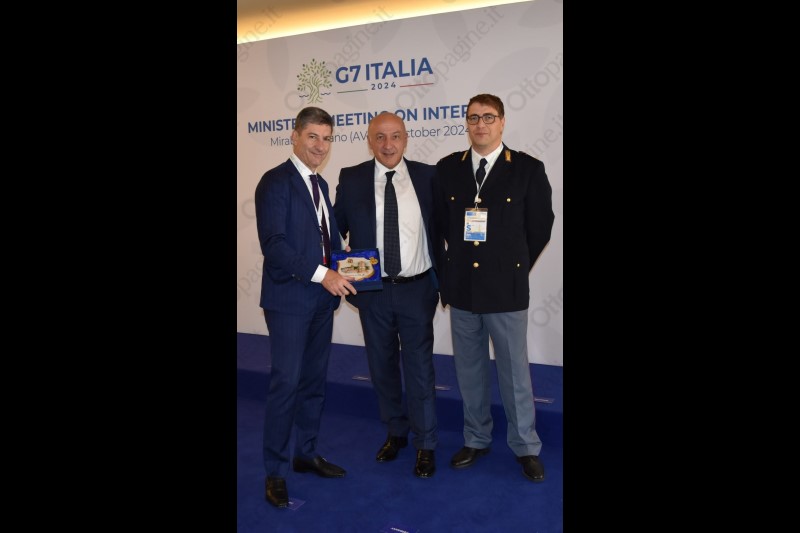 In occasione della conclusione del vertice dei ministri dell'interno G7, che si è svolto dal 2 al 4 ottobre a Mirabella Eclano, il questore della provincia di Avellino, Pasquale Picone, ha voluto rendere omaggio al ministro dell'interno, Matteo Piantedosi, e al capo della polizia, Vittorio Pisani, con la consegna del primo crest della questura di Avellino.