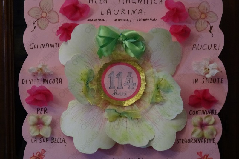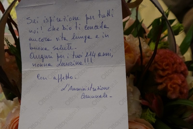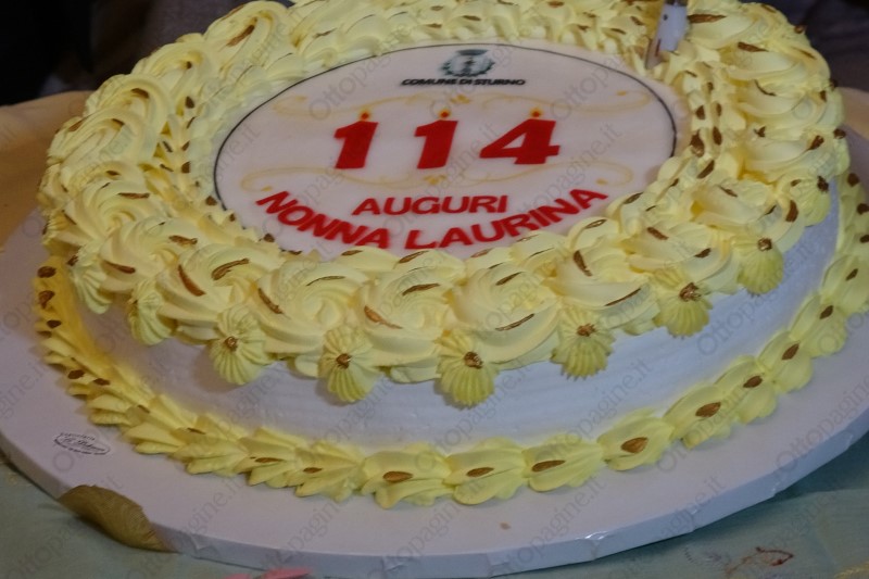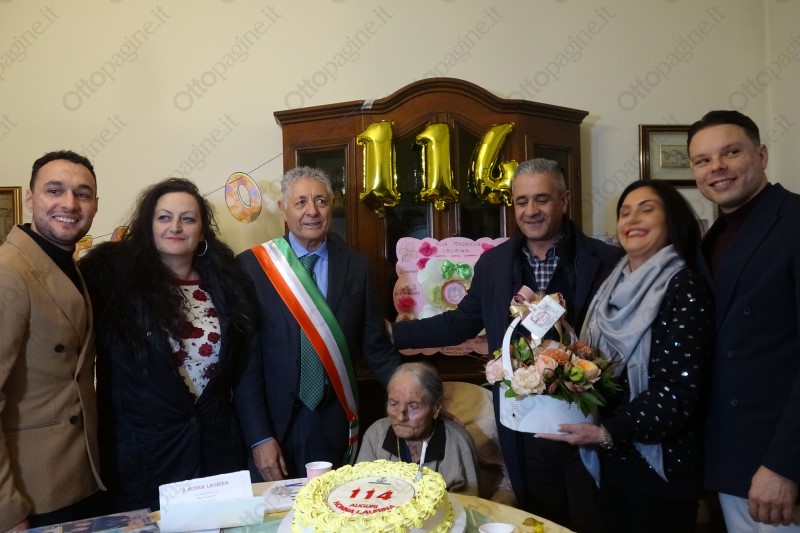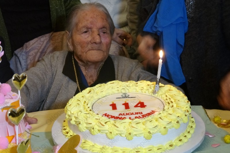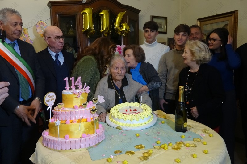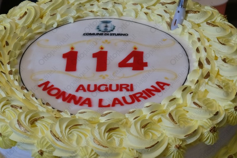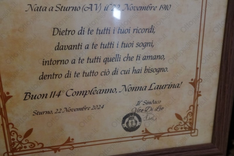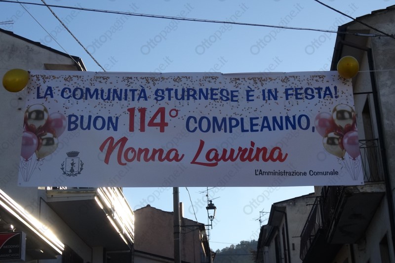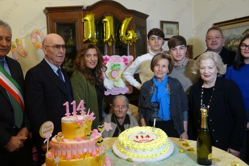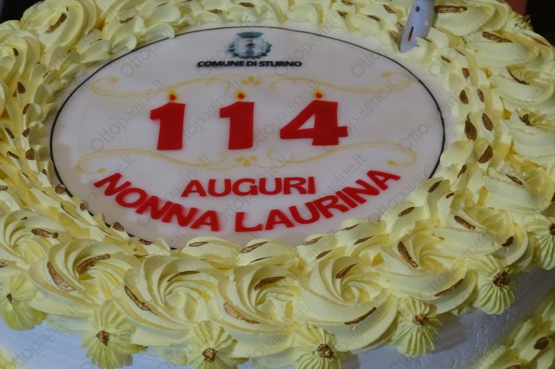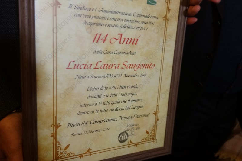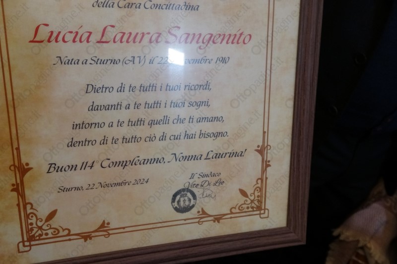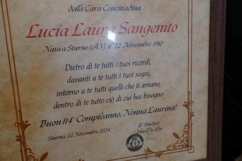 "Dentro di te tutti i tuoi ricordi, davanti a te tutti i tuoi sogni, intorno a te tutti quelli che ti amano, dentro di te tutto ciò di cui hai bisogno". Sono le parole del sindaco Vito Di Leo e dell'intera amministrazione comunale di Sturno, rivolte a Lucia Laura Sangenìto per i suoi incredibili e straordinari 114 anni. Uno striscione lungo la strada che porta alla sua abitazione, palloncini, fiori e una torta decorata con lo stemma del paese.